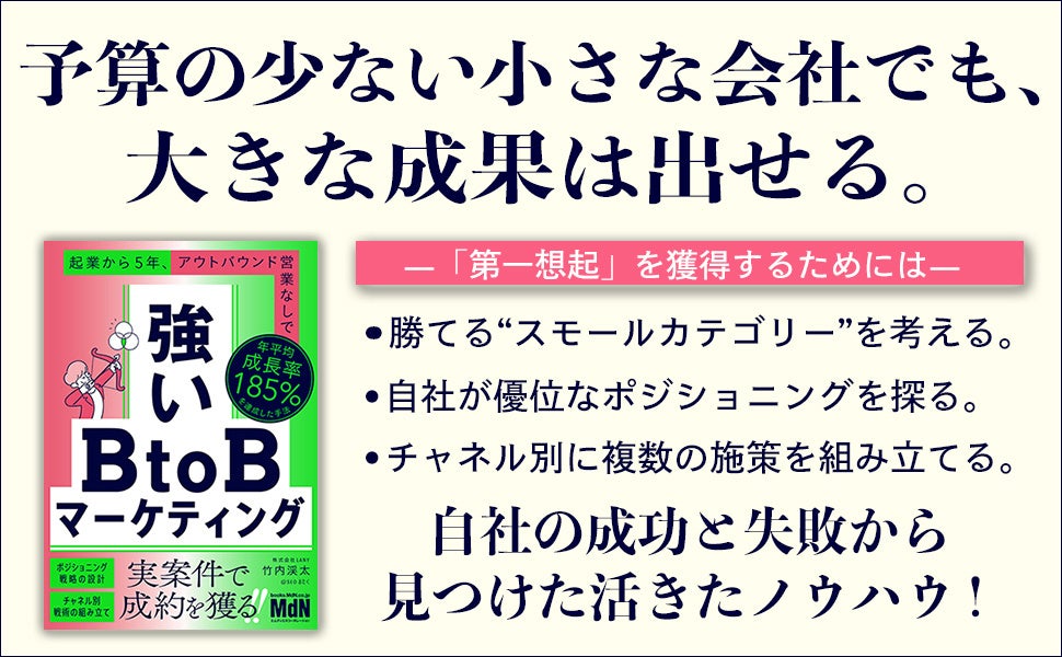 デジタルマーケティング支援をおこなう株式会社LANY(レイニー/東京渋谷区)代表取締役社長・竹内渓太は、二冊目の著書となる書籍『強いBtoBマーケティング 起業から5年、アウトバウンド営業なしで年平均成長率185%を達成した手法』をエムディエヌコーポレーションから2025年6月27日に出版します。