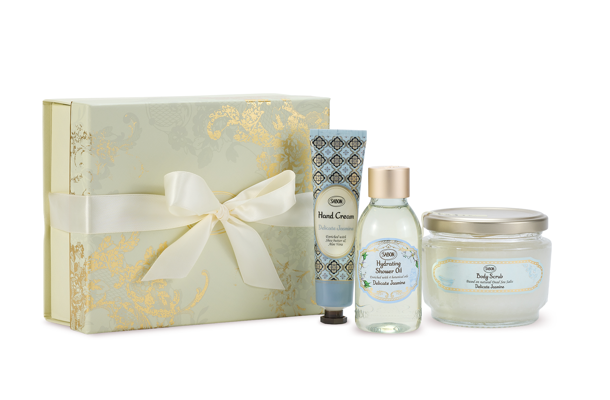 内容 ハイドレイティング シャワーオイル 100mL、ボディスクラブ 320g、ハンドクリーム 30mL、ギフトボックス