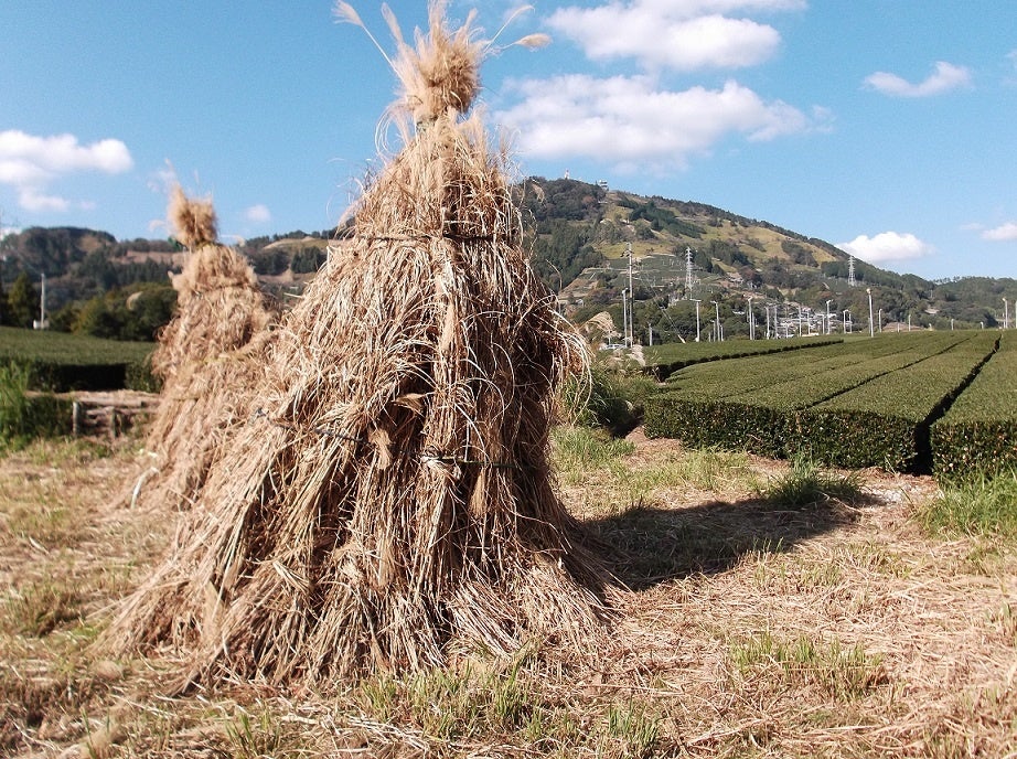 茶草場農法とは、茶園の畝間にススキやササを主とする刈敷きを行う伝統農法のことです。この茶草によって、茶の味や香りが良くなると言われています。静岡県の茶栽培では、秋から冬にかけて、茶園の周辺にある“茶草場”の草を刈って茶園の畝間に敷く作業が行われています。夏にはただの草むらにしか見えない茶草場ですが、秋になると綺麗に草は刈られ、刈られた草が束ねられて干してある風景を見ることができ、静岡県の茶栽培の特徴とも言えます。