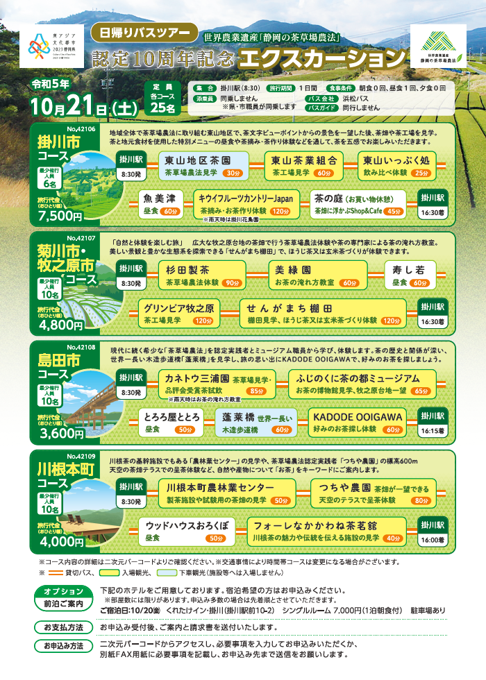 「静岡の茶草場農法」認定地域である4市1町(掛川市、菊川市、島田市、牧之原市、川根本町)の魅力を満喫する計4コースの日帰りバスツアー