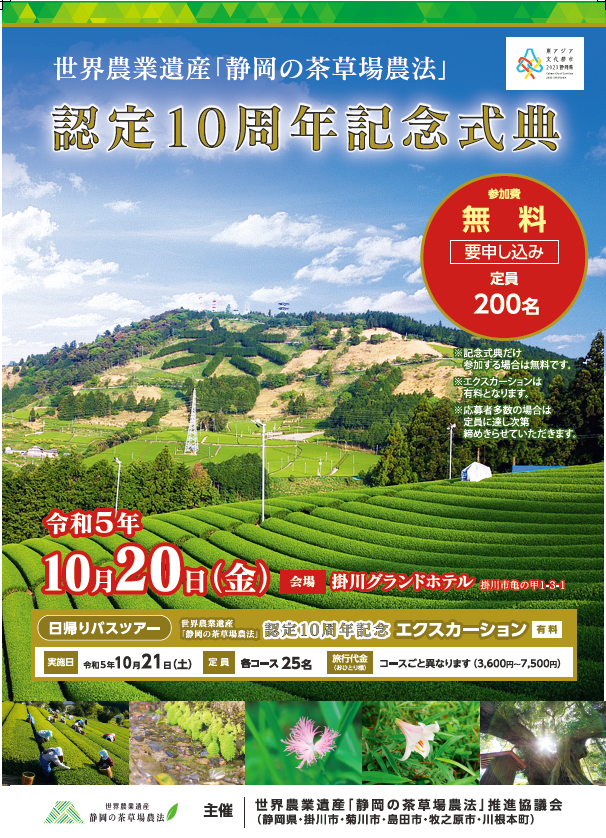 10月20日(金)には、掛川グランドホテル(静岡県掛川市亀の甲1-3-1)にて、記念式典をはじめ、認定地域の特産品販売や国内農業遺産認定地域によるPRブースを設けます。10月21日(土)には、認定地域の魅力を満喫する日帰りバスツアーを計4コース開催します。