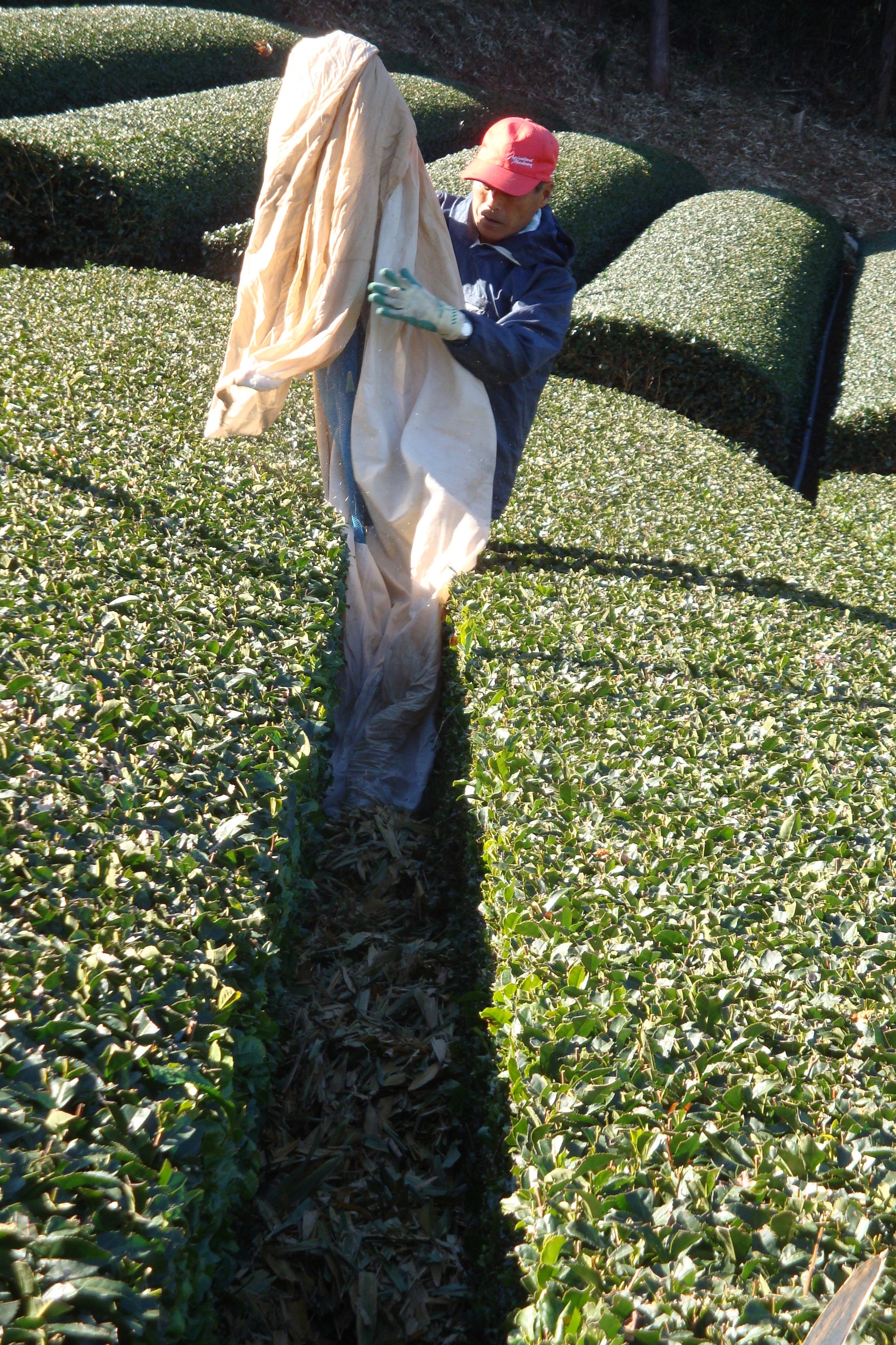 <“かっぽし”で乾燥させた茶草を畝間に敷く様子>