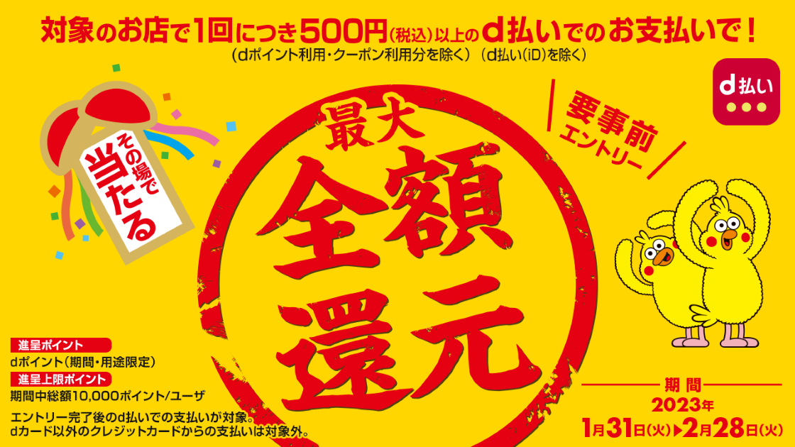 1月31日(火)から2月28日(火)まで「その場で当たる!最大全額還元!d払い抽選キャンペーン」開催中