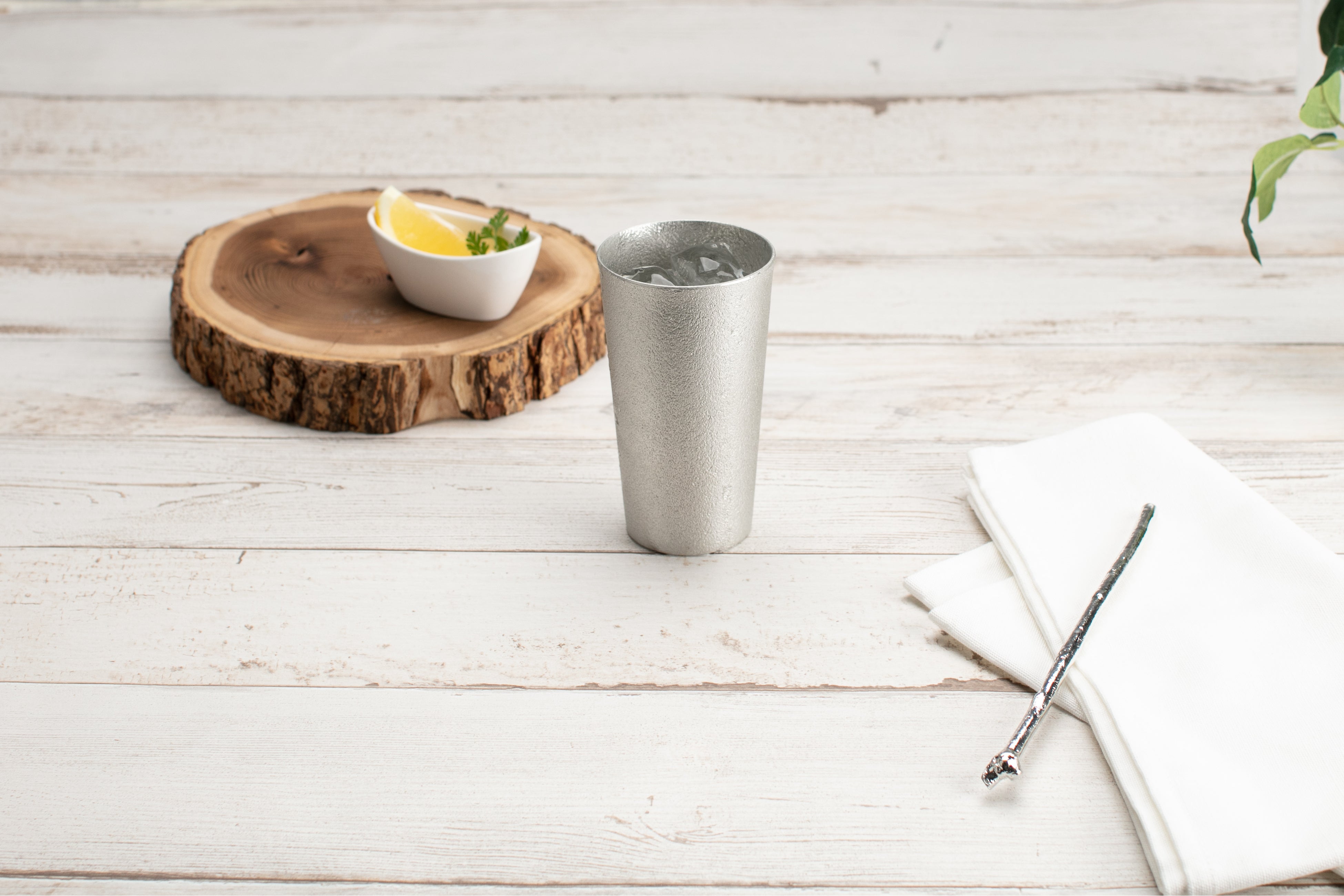 錫(すず)100%で作られた鋳物で、鋳込む際にできる梨地調の少しザラザラとした鋳肌により、ビールのまろやかな泡立ちを生み出します。熱伝導率がよいので冷蔵庫に1~2分入れると、キンキンに冷えたビールをお楽しみいただけます。