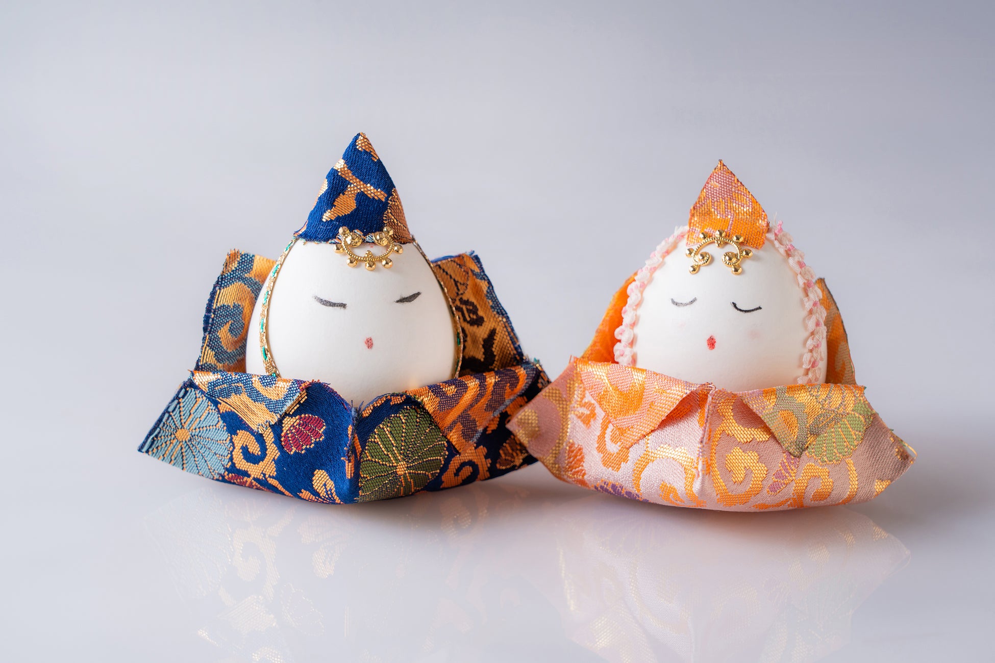 内容:卵の殻に西陣織の布で衣をまとわせ、お顔の表情を描いてお内裏様を制作します。なお、すでにお顔の表情が入っているものもご用意しています。