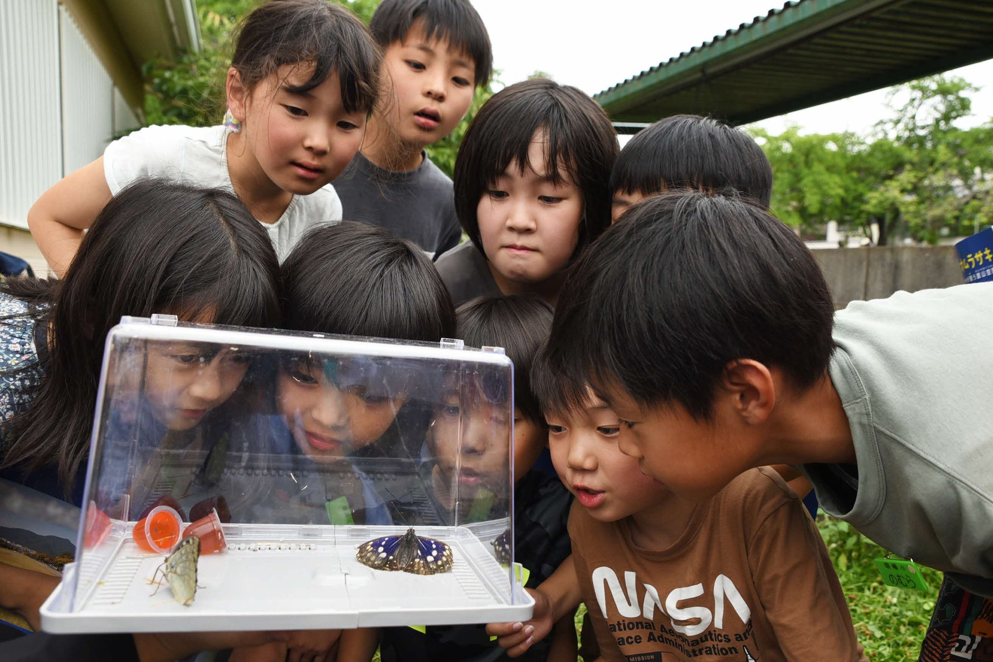 児童たちは、授業の休み時間などを利用して飼育ケージに通い、紫に輝く羽を動かして舞うオオムラサキの姿を楽しんでいます。