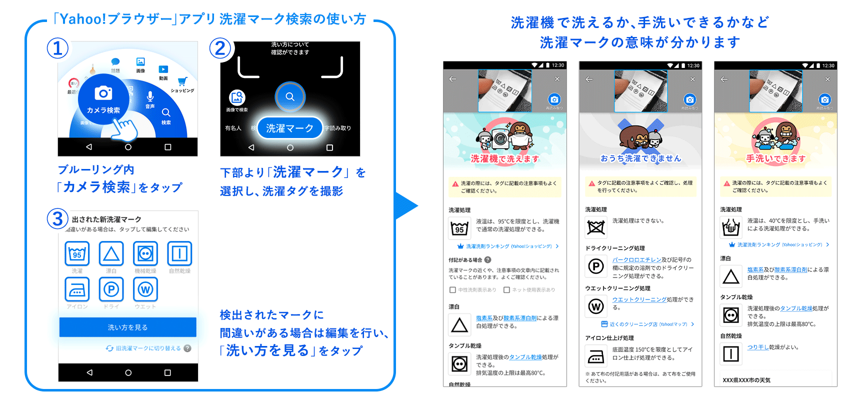 ヤフー株式会社(以下、Yahoo! JAPAN)が提供する、累計約1,500万ダウンロードのAndroidアプリ「Yahoo!ブラウザー」は、本日、独自開発の人工知能(AI)による画像解析技術を用いて、洗濯タグを写真に撮るだけで適切な洗濯方法を調べられる「洗濯マーク検索」(以下、本機能)の提供を開始しました。