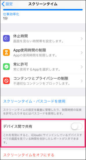 Apple IDを複数のiOS端末で併用していると、そのApple IDに関する合計時間がカウントされてしまいます。他の端末の使用時間をカウントしないようにしたい場合は、「設定」―「スクリーンタイム」―「デバイス間で共有」をOFFにしてください。