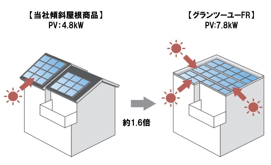 今回発売する『グランツーユーFR 』は、当社の強みである高い住性能を維持しながら、当社2階建て商品の中で最も低価格帯に位置付ける商品です。当社木質系住宅として初めてフラットルーフを導入することで、屋根に関する作業工程をできるだけ工場内で行い、生産・輸送を効率化。建築コストの削減を実現するとともに、太陽光発電システム(以下PV)の大容量化が可能となりました。加えて、蓄電池、HEMS(ホーム・エネルギー・マネジメント・システム)、当社独自の空調システムを組み合わせ、日常の快適性や光熱費の軽減、災害時のレジリエンス性も確保します。