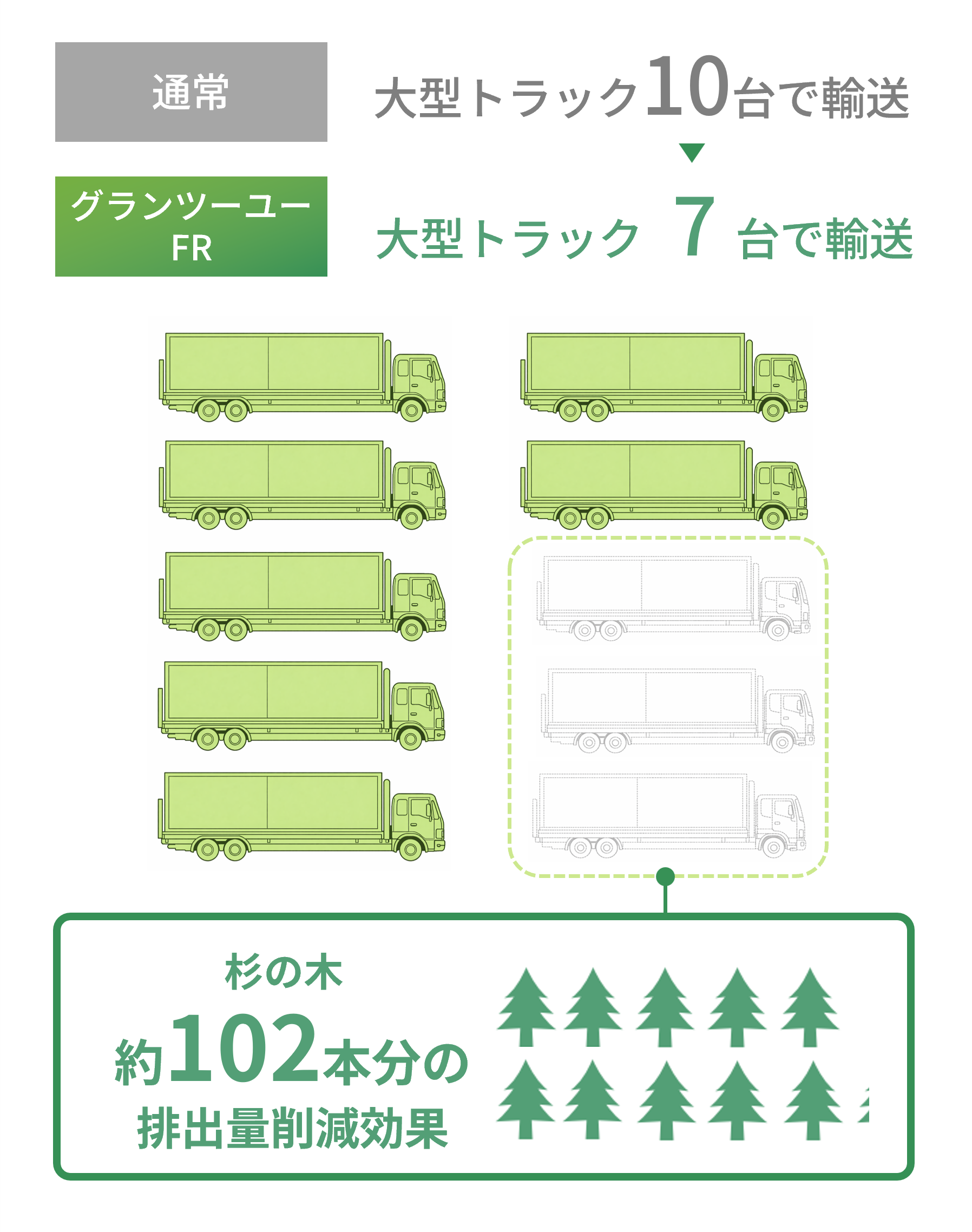 また、1邸あたりの輸送CO2排出量は約0.9t-CO2削減(※5)となり、これは杉の木約102本が1年間に吸収するCO2量に相当します(※6)。