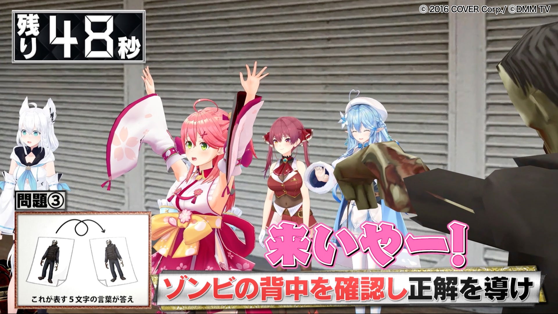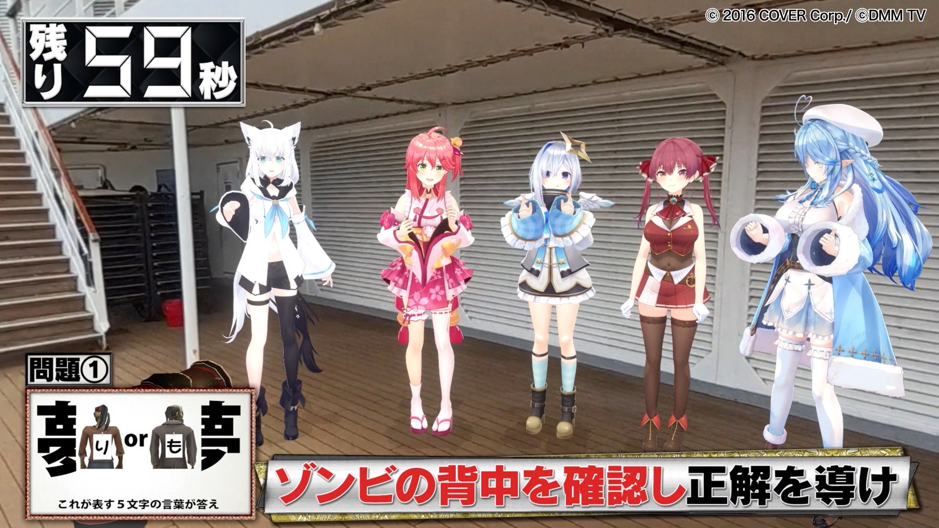 合同会社DMM.com(本社:東京都港区、会長 兼 CEO 亀山敬司、https://dmm-corp.com/ 以下DMM )が運営するDMMの総合動画配信サービス「DMM TV」にて、カバー株式会社が運営する女性VTuberグループ「ホロライブ」との大型企画が始動!人気タレント・白上フブキ、さくらみこ、宝鐘マリン、天音かなた、雪花ラミィが出演するDMM TVオリジナルバラエティ番組「DMM TV × ホロライブ 新感覚ドキュメントバラエティ ホロなゾンビ!」の第3話が本日より配信開始しました。
