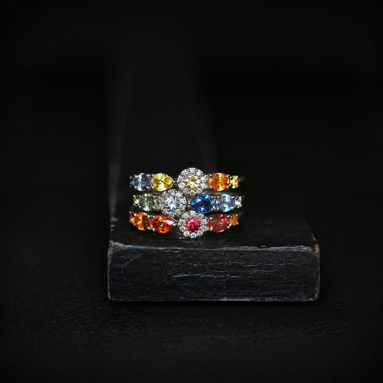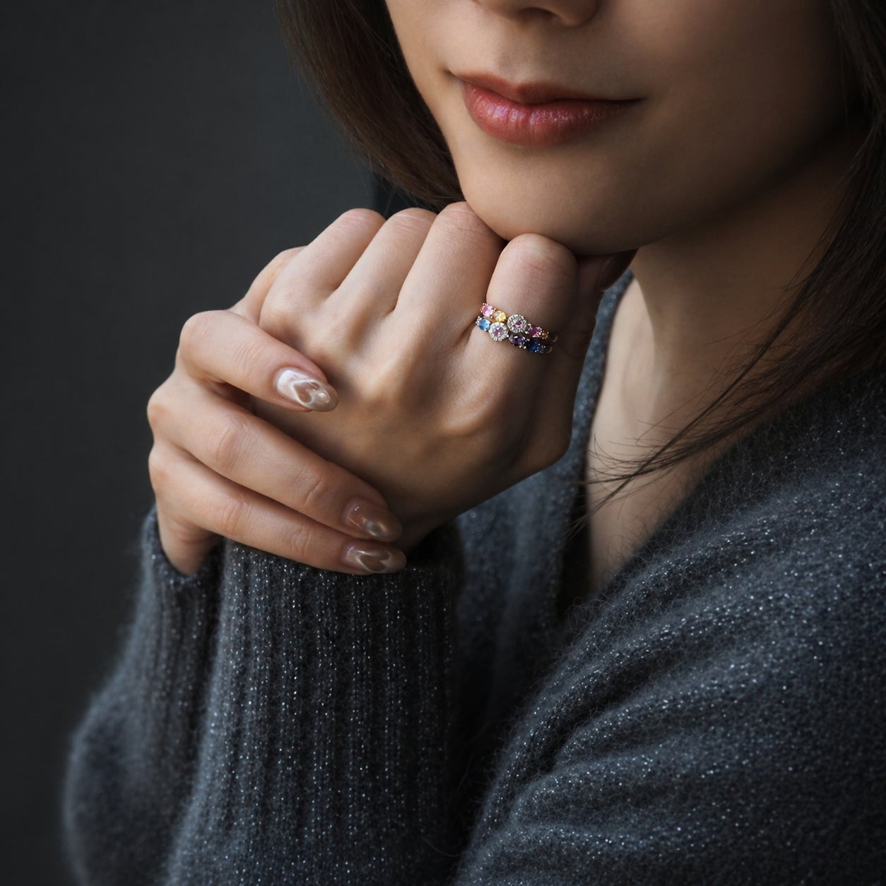 花束のように色彩が連なるCent Couleurを、今回はルビーとサファイアという同じコランダムに属する宝石のみを用い、ダイヤモンドとともに仕立てました。赤、青、イエロー、オレンジと、それぞれに異なる色調を宿しながらも、同じ鉱物ならではの透明感と輝きが全体に統一感をもたらし、華やかさのなかに端正な印象を生み出しています。