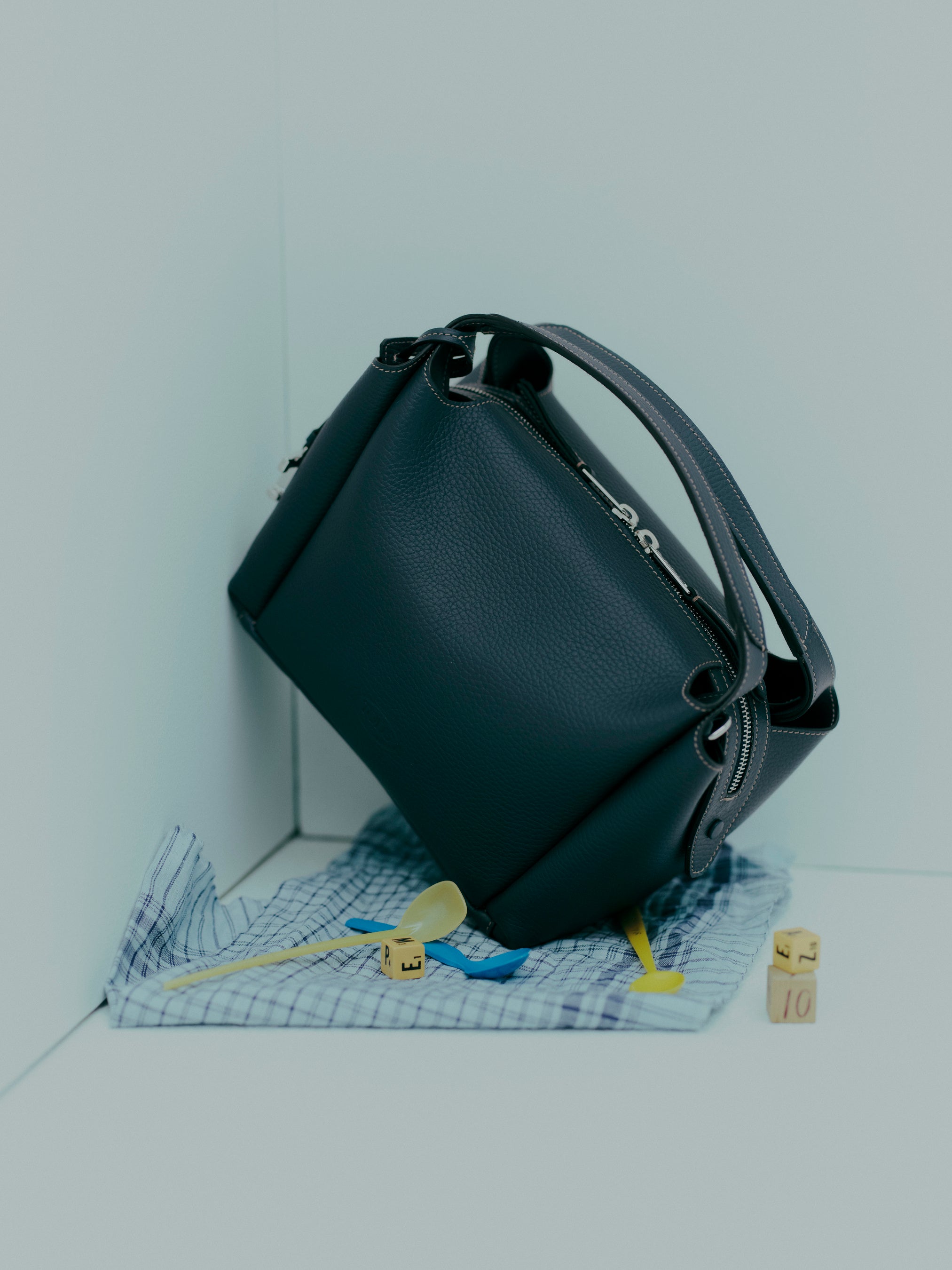 美しいトゥアレグブルーと、さわやかなアイボリーの2色を特別にロンハーマン限定色として展開。ダブル フラット ハンドルと取り外し可能なショルダーストラップに加え、ダブルスライダーファスナーの両サイドにはカバードスナップを施し、エレガントさと機能性を兼ね備えています。立体的に仕立てられた縫製によって生まれる、やわらかな丸みのあるフォルムが魅力で、しっかりとしたマチにより高い収納力と実用性も備わったバッグです。