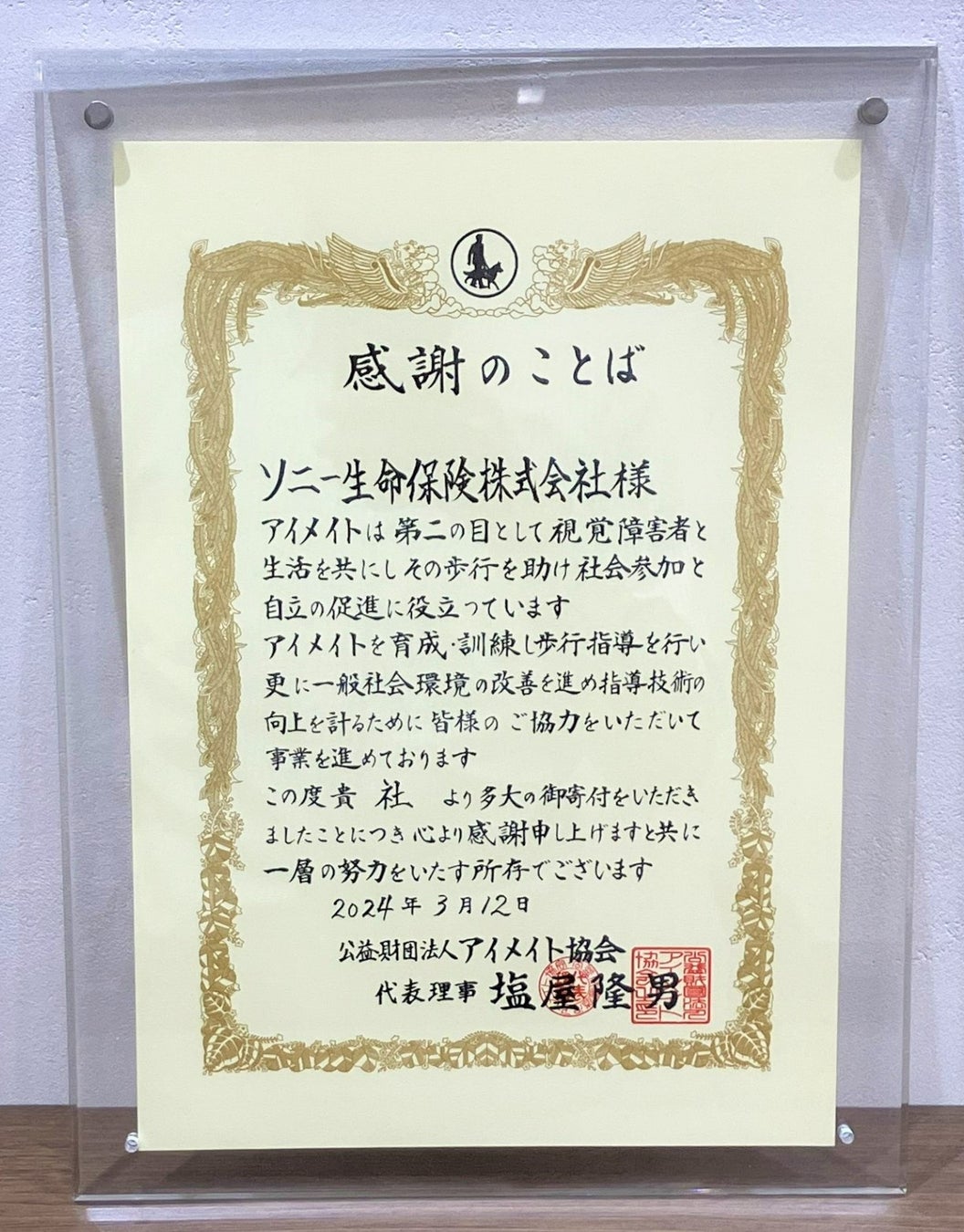 これらの募金活動は、1年間に社員から寄せられた金額に会社が同額の支援を行う「マッチングギフト方式」をとっており、その募金をアイメイトの育成を行うアイメイト協会に贈呈しております。2023年度は、全社員からの募金が約454万円集まり、会社の特別寄付金とあわせて908万円の寄付金を贈呈しました。その結果、当社のアイメイト育成事業に対する寄付金の総額は約2億9,430万円となりました。