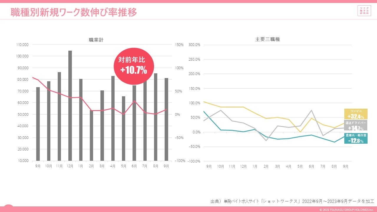 2.新規ワーク数は、前年同月比+10.7%。主要職種ではコンビニスタッフが+32.4%と伸長