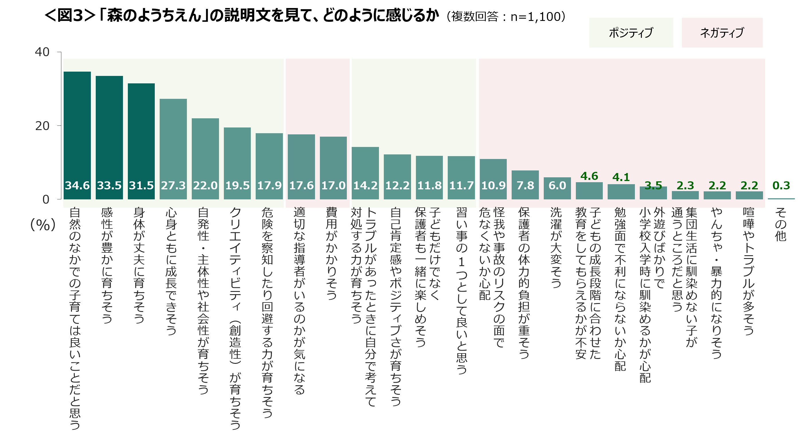 「森のようちえん」の印象は、「自然のなかでの子育ては良いこと」、「感性が豊かに育ちそう」、「身体が丈夫に育ちそう」がトップ3。
