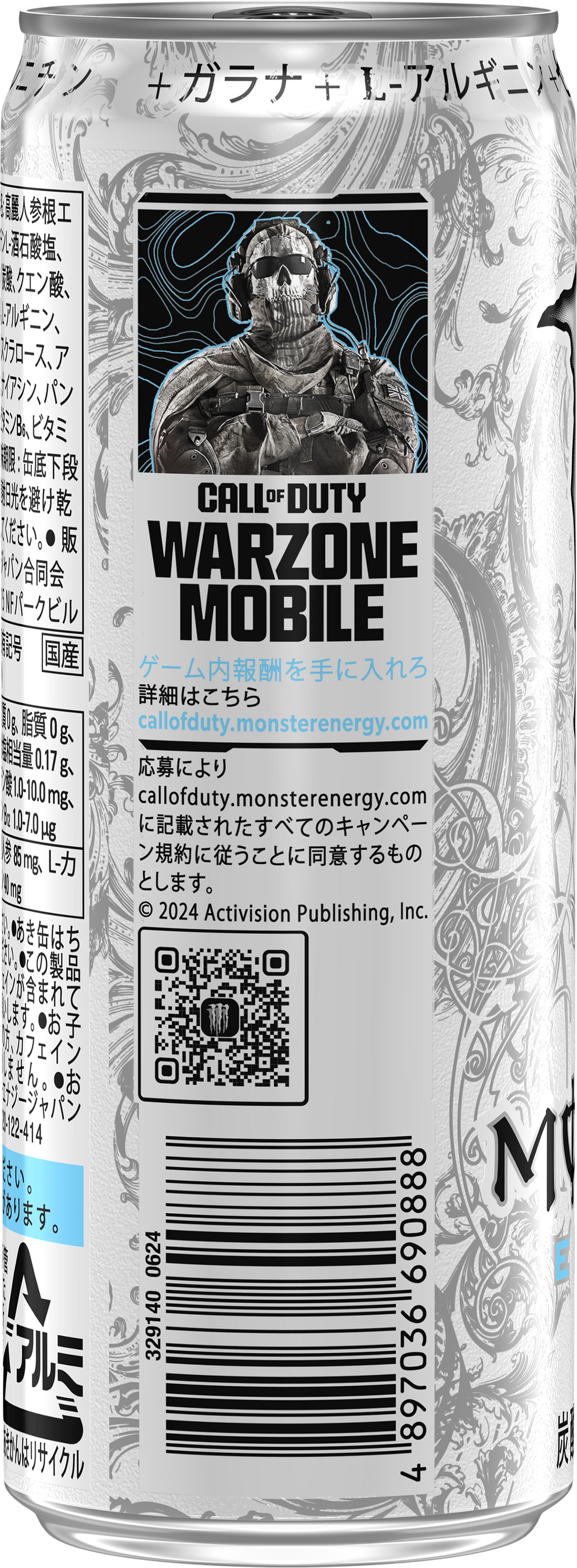 本キャンペーンは、期間中に対象店舗にてモンスター商品を購入したレシートを撮影しキャンペーンサイトへ応募することでご参加いただけます。 1本購入ごとに必ずインゲームアイテムが手に入り、1本目から3本目までの購入ではキャンペーン限定デザインの「武器設計図」、「オペレータースキン」、「デカール」、4本目以降は「ダブルXP」が必ずもらえます。さらに、10月1日(火)頃より順次店頭にて、『コール オブ デューティ®』の人気キャラクター「ゴースト」がデザインされたモンスターエナジーとモンスター ウルトラを数量限定のコラボ缶として発売いたします。