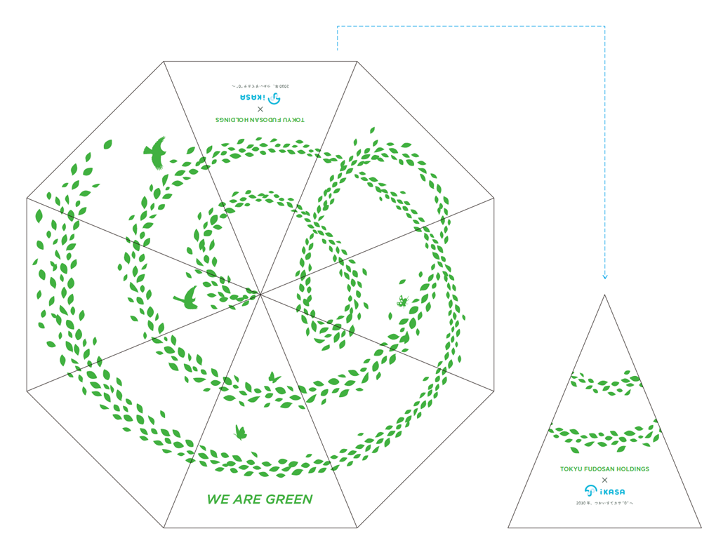 中央から、葉や生き物が飛び交い広がっていくイメージをシルエットイラストで表現。東急不動産の二階堂ふみさんが登場する企業CM(「環境先進で未来を拓く」CM特設サイト|https://www.tokyu-land.co.jp/company/kankyo-mirai/)を彷彿させるようなグリーンを活用したさわやかな傘に仕上げました。