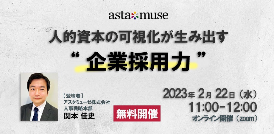 アスタミューゼ株式会社(本社:東京都千代田区、代表取締役社長 永井歩)は、企業の人事・総務・採用担当者向けに「人的資本の可視化」をテーマにした無料ウェビナー「人的資本の可視化が生み出す“企業採用力”」を2023年2月22日(水)11:00~12:00に開催します。