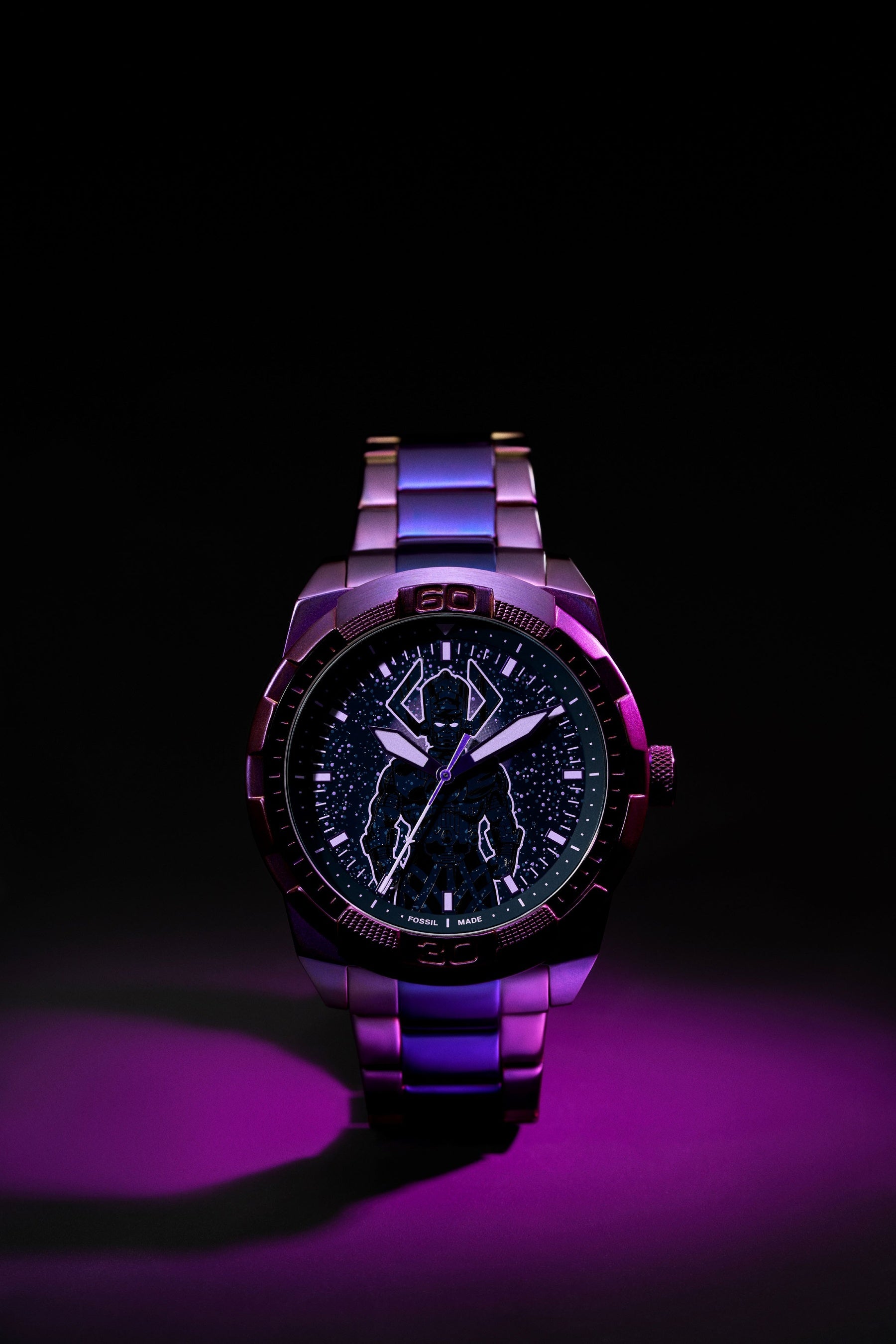 さらに、星を喰らう存在として知られるヴィラン「ギャラクタス」をイメージした「ギャラクタス ウォッチ(Galactus Watch)」は、夜空に浮かぶシルエットをルミナス仕様のダイアルで表現。ケースバックにはクラシックなコミックアートをプリントしています。パープルに仕上げたブラッシュドステンレススティール製ケースと、3針クオーツムーブメントを搭載。さらに、シルバーサーファーをイメージしたラペルピンが特典として付属します。