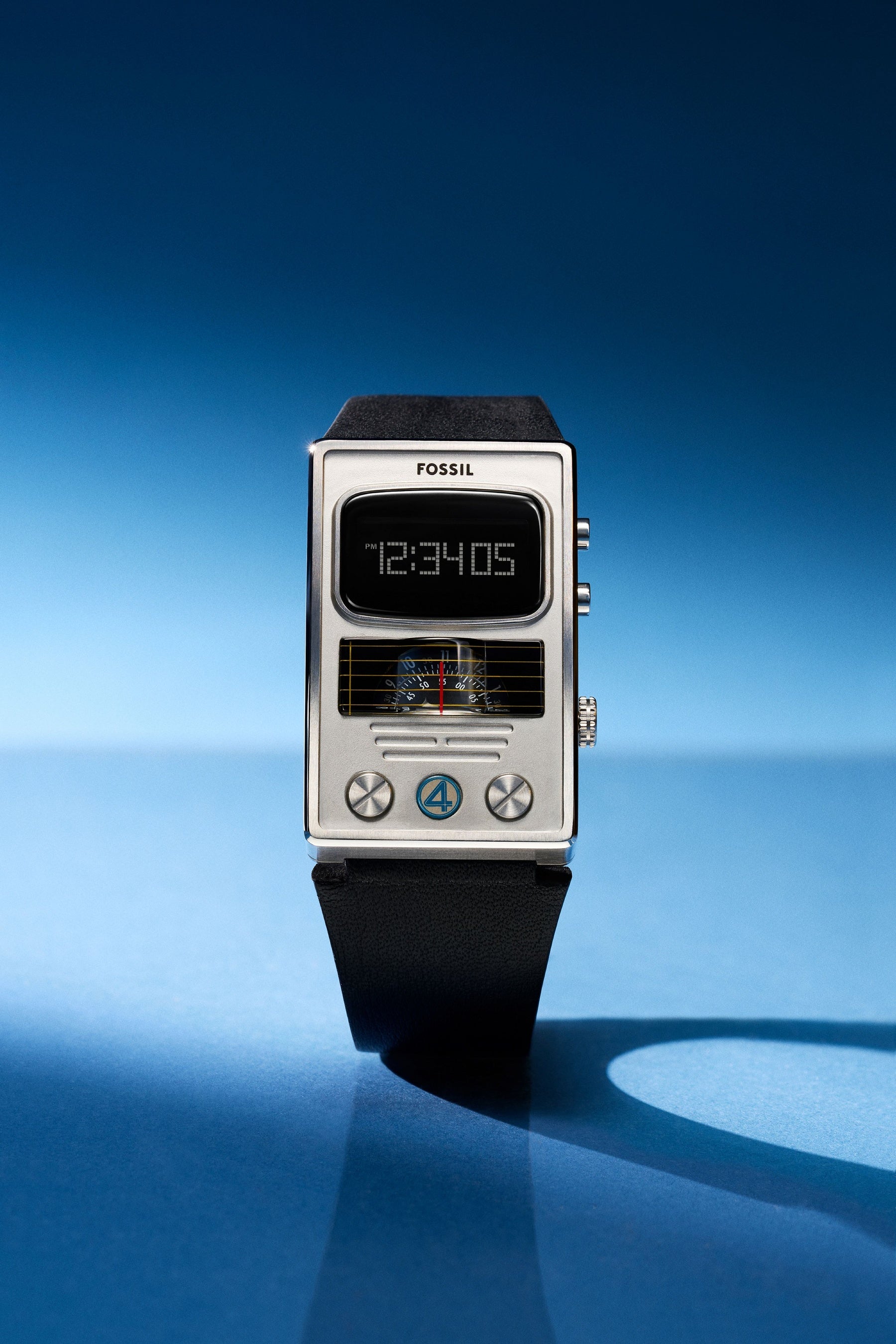 LCDデジタルモジュールとアナログのデュアル表示、クオーツムーブメントを備えたアナデジウォッチ「デジ・カルク ウォッチ(Digi-Calc Watch)」は、劇中でファンタスティック4のメンバーが着用する多機能デバイスをモチーフに開発されました。リーダーであるミスター・ファンタスティックが設計したこの端末は、通信・セキュリティなどの機能を搭載。シルバートーンのケースに、チームスーツに着想を得たブラックストラップ、そしてケースとストラップに施された「ファンタスティック4」のロゴが特徴です。