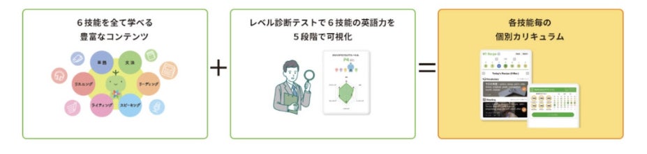 AIが自動で毎日の学習カリキュラムを作成する機能です。AIが自動生成したアプリ内のテストで、単語・リスニング・文法・リーディング・スピーキングの各技能を5段階にレベル分けします。生徒一人ひとりのレベルや学習時間に合わせて、毎日オリジナルのカリキュラムを配信することで、生徒が自主的に、必要な学習に取り組めるようになります。