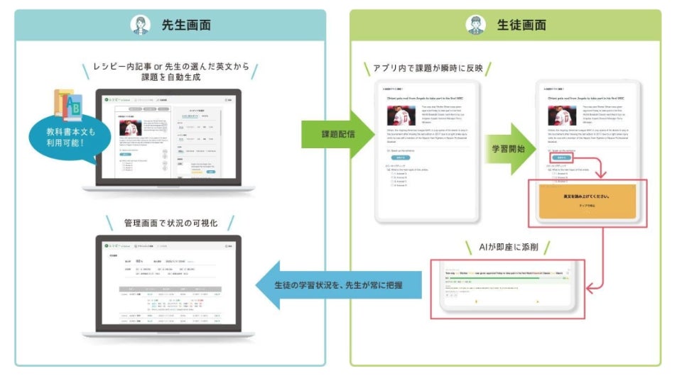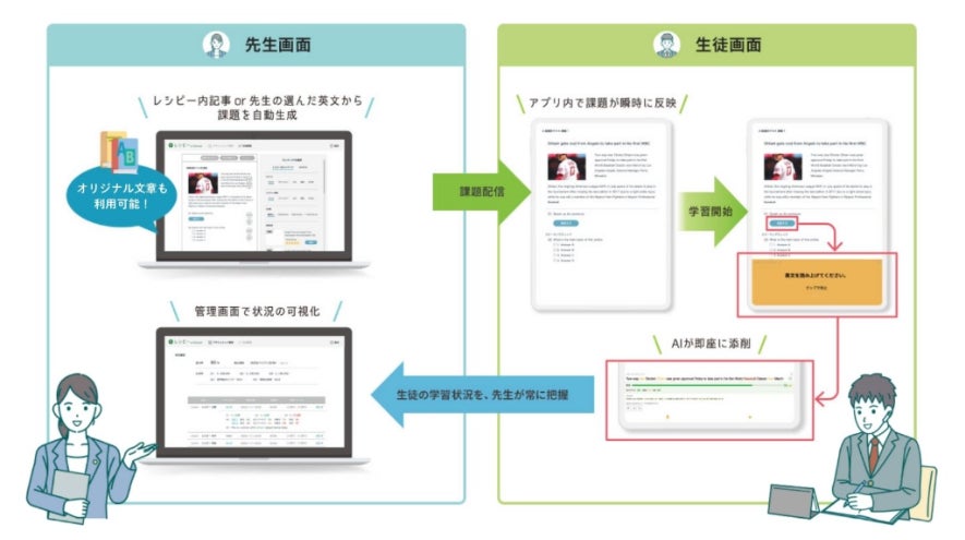 『レシピー for School』内のさまざまなニュース記事や先生の選んだ文章を入力するだけで、授業や宿題に活用できる単語や内容理解の問題、ライティング・スピーキングの問題をAIが自動で生成します。答案の採点やフィードバックもAIが行うため、問題作成から採点、生徒の成績管理までがアプリ内で完結します。