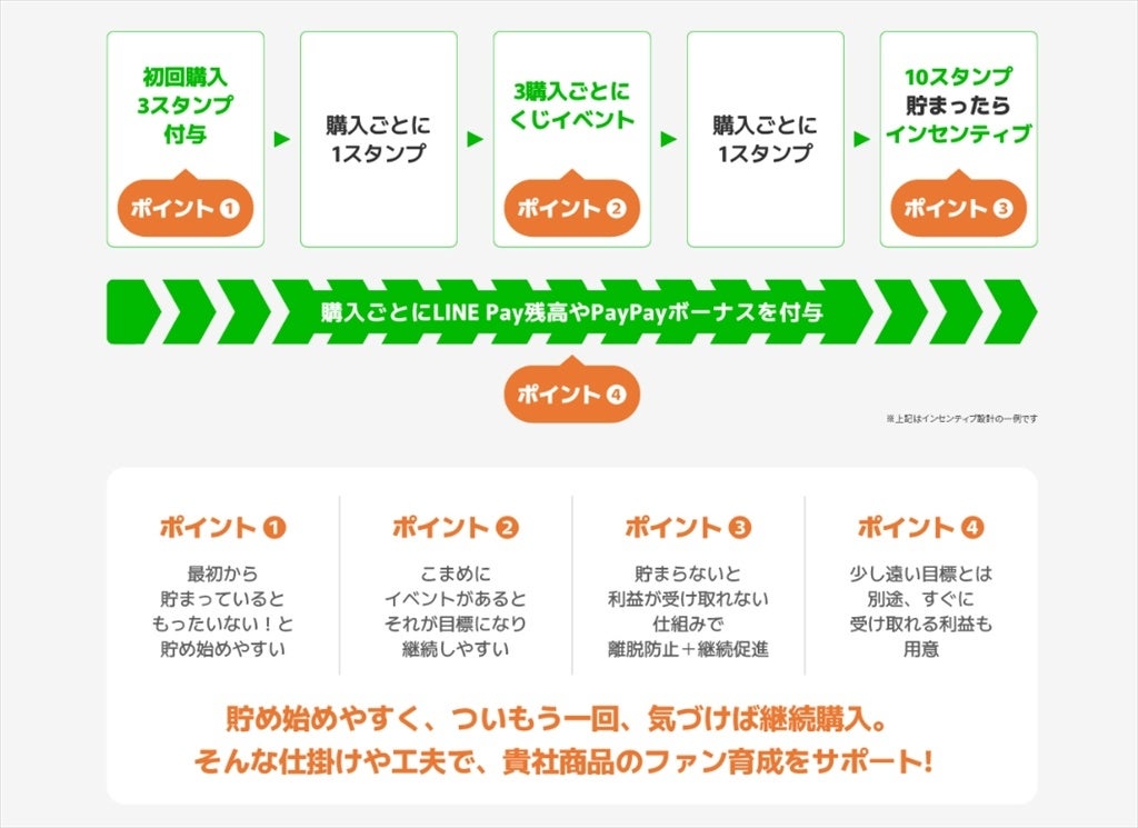 ④スタンプ貯蓄促進施策サポート(例:購入ごとのLINE Pay残高やPayPayボーナス付与)