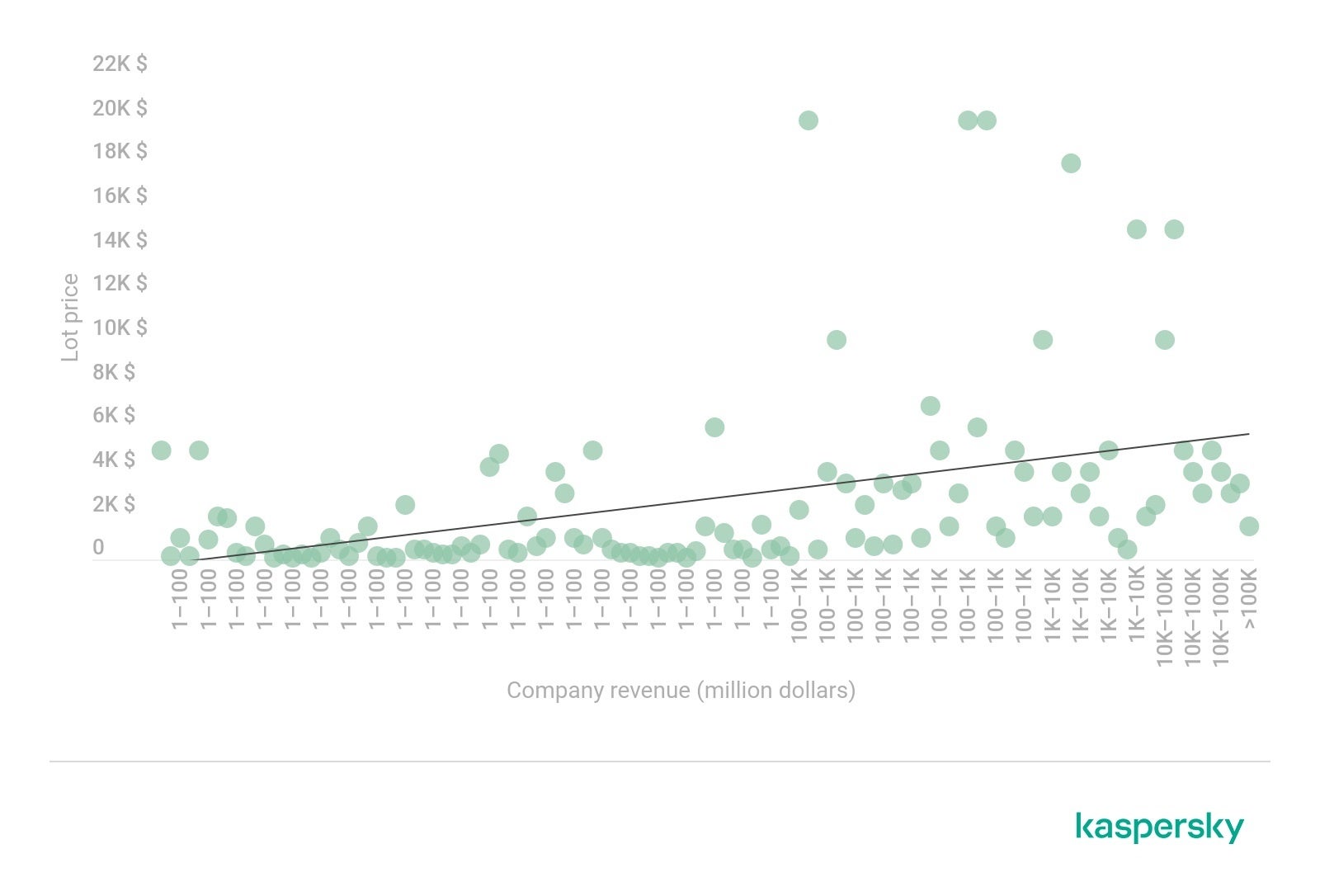 企業ネットワークへの不正アクセスの価格を決める最も重要な要素は、そのアクセスを利用して攻撃を行った場合に、購入者が得ることができる金額です。ランサムウェアを使用する攻撃者が、ある企業ネットワークに侵入するための初期アクセスのデータに、数千ドル、時には数万ドルを支払う理由は、その攻撃対象の企業から何百万ドルもの身代金を得られる可能性があるためです。
