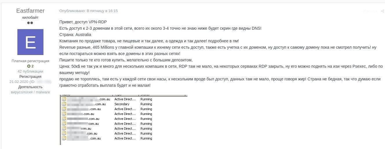 また、大企業のネットワークに不正アクセスするためのRDPのデータは、2,000~4,000ドルで販売されていました。これは比較的購入しやすい値段設定ではあるものの、上限が存在せず、収益が4億6,500万ドルの企業のデータは5万ドルで販売されていました。