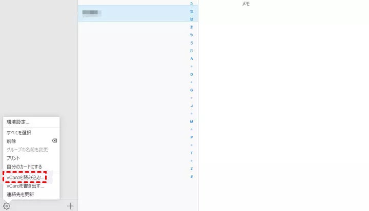 Step1.ブラウザを開き、iCloudのウェブサイトにアクセスします。ログインしたら、「連絡先」を開きます。画面左下にある「設定」アイコン(歯車のアイコン)をクリックし、「vCardを読み込む」を選択します。