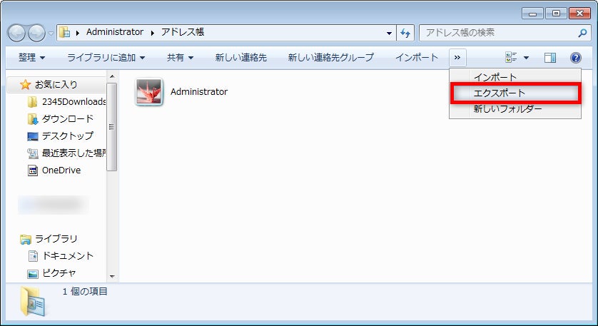 Step3.Windowsアドレス帳のフォルダが画面に表示されます。iPhoneに転送したい連絡先を選択し、その後「エクスポート」をクリックします。