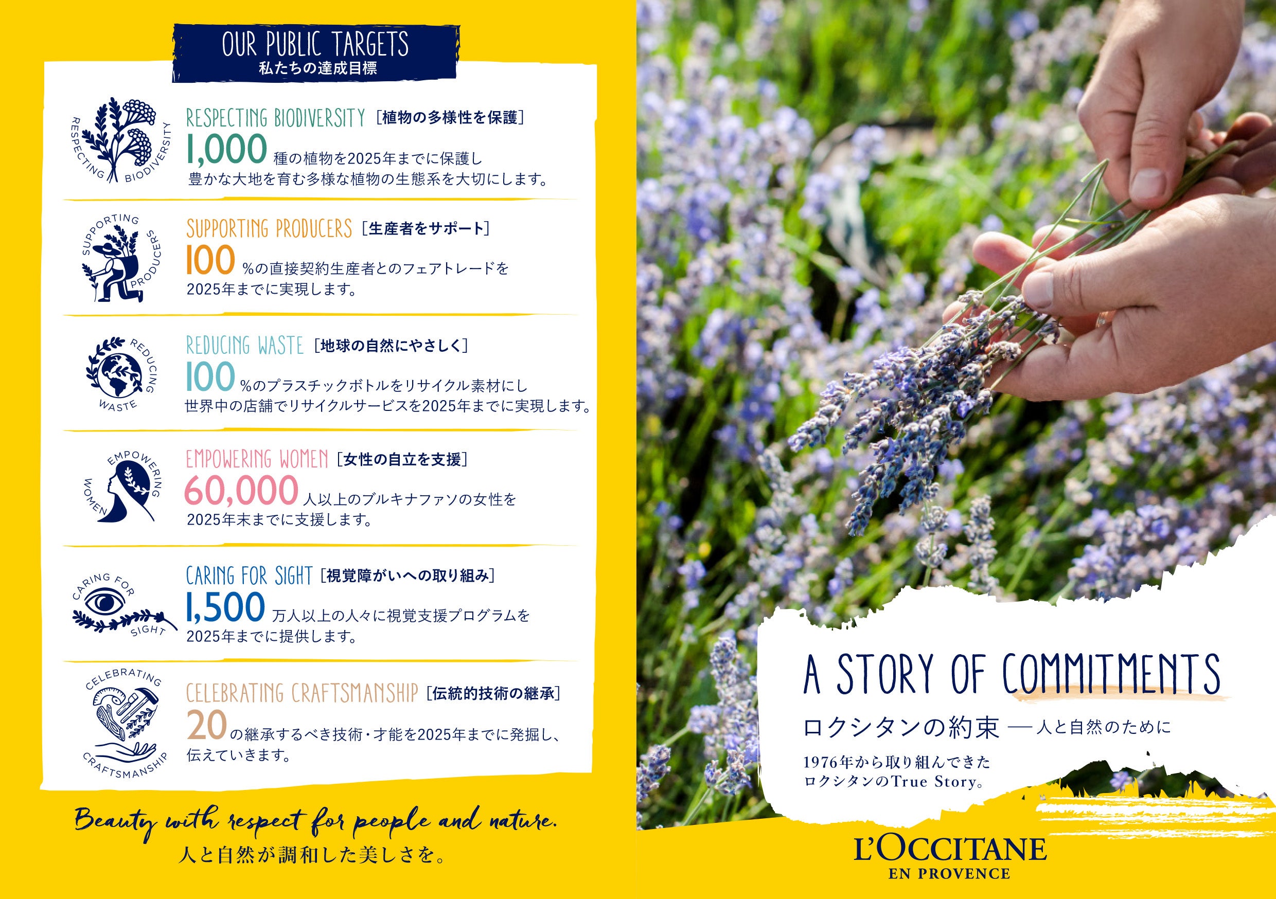 創設当初から、南仏プロヴァンスをはじめとする豊かな自然や、そこから生まれる製品を作り出す人々と技術を守ることを使命とし、自然の保護や人を大切にする取り組みを長年続けてまいりました。現在では「ロクシタンの約束」として、「植物の多様性の保護」、「生産者をサポート」、「地球の自然にやさしく」、「女性の自立の支援」「視覚障害への取り組み」、「伝統的技術の継承」の6つを主要な活動分野として定め、それぞれに対し具体的な数値目標をグローバルで掲げ、その目標達成に向けて各国で様々なCSR活動を行っております。