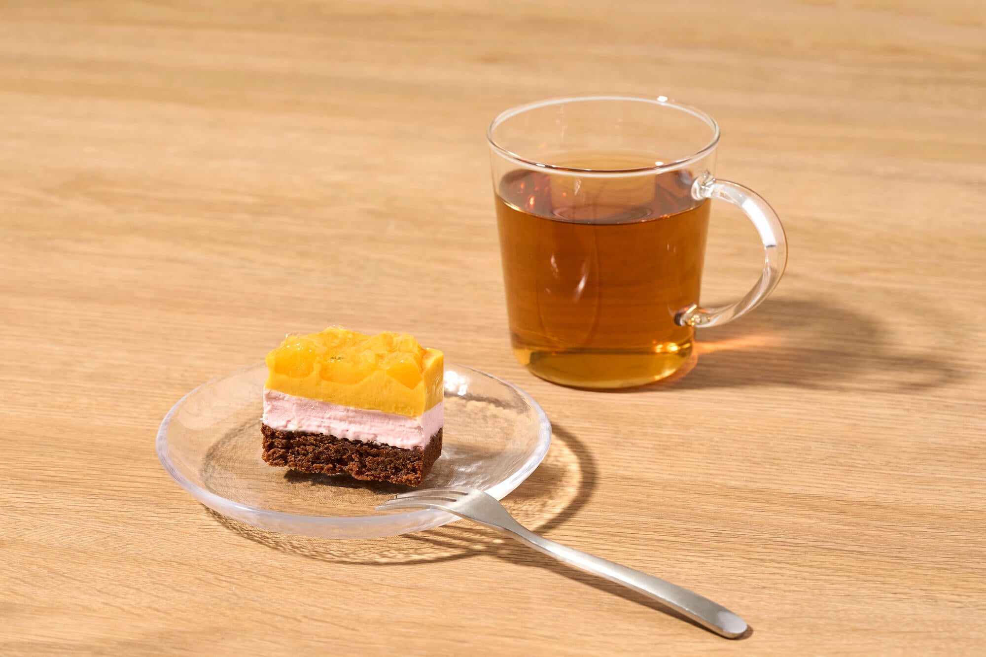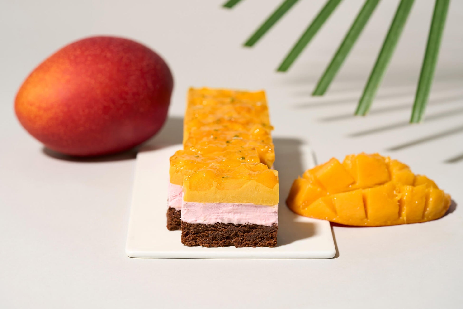 香りと甘さが格別な完熟宮崎マンゴーをふんだんに使用。フレッシュな角切りとピューレの両方でその魅力を存分に引き出しました。マンゴーを主役に、フランボワーズのレアチーズケーキと生ガトーショコラ生地を3層に重ねた、果実と素材のハーモニーを堪能できる冷たい夏スイーツです。