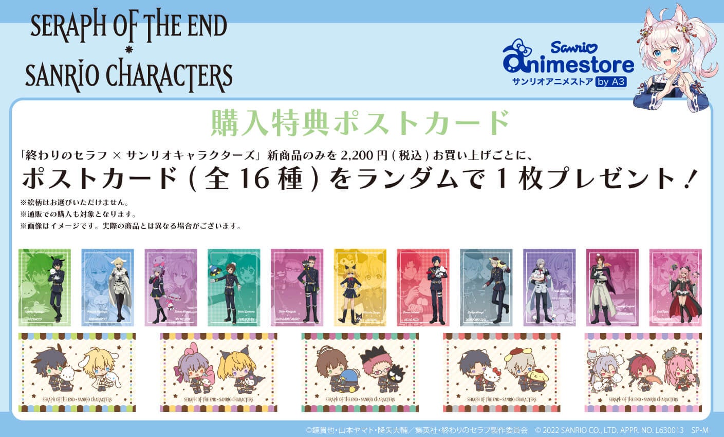ポストカードは「終わりのセラフ×サンリオキャラクターズ」の新作グッズのみを2,200円(税込)お買い上げごとに、16種類のうち1枚をランダムでお渡しします。