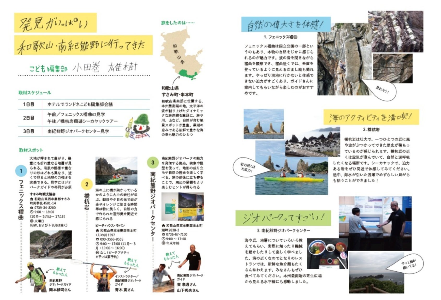第一弾は、和歌山県観光連盟と連携し、南紀熊野ジオパークを舞台に実施。親子で体験した自然や文化を、子ども自身の言葉と写真でまとめ、記事や冊子として発信しました。今後は全国の自治体や地域と連携し、体験・編集・発信を組み合わせ、次世代の視点から各地の魅力を伝えていく予定です。