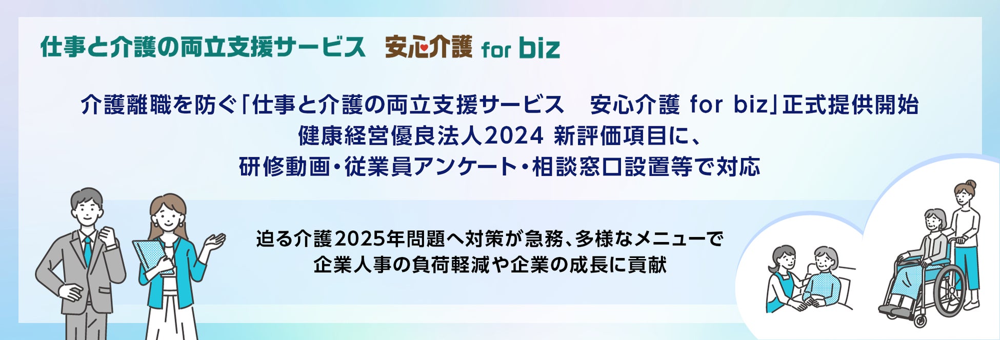 介護離職を防ぐ「仕事と介護の両立支援サービス 安心介護 for biz」正式提供開始。健康経営優良法人2024新評価項目に、研修動画・従業員アンケート・相談窓口設置等で対応