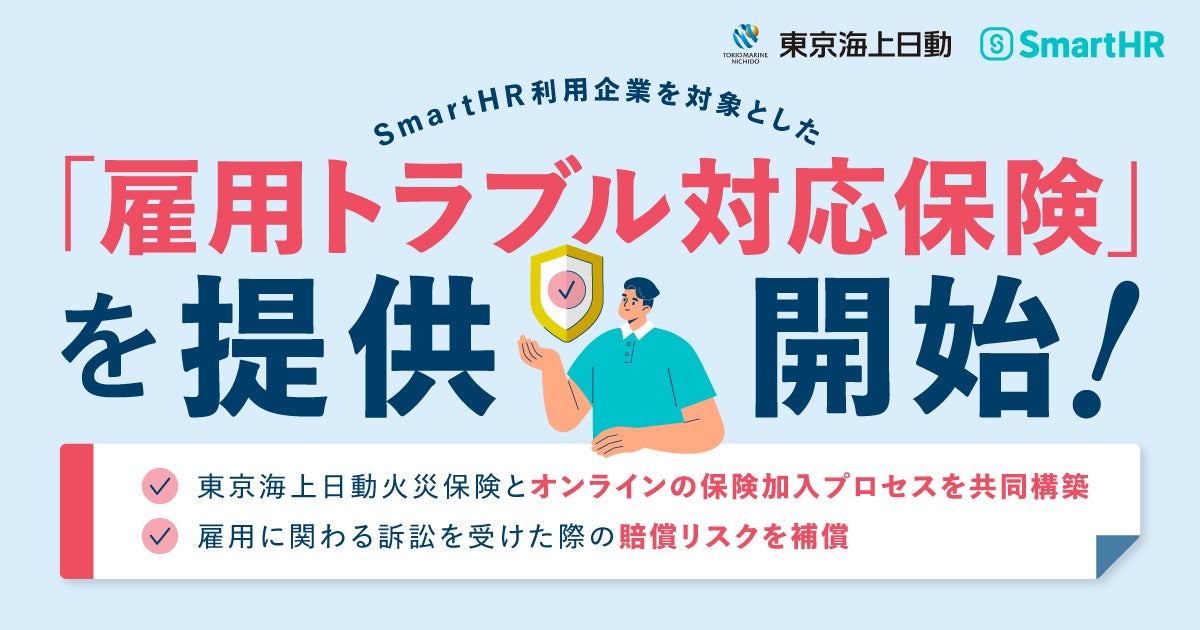 クラウド人事労務ソフト「SmartHR(スマートエイチアール)」を運営する、株式会社SmartHR(本社:東京都港区、代表取締役CEO:芹澤 雅人、以下「SmartHR」)は、東京海上日動火災保険株式会社(本社:東京都千代田区、取締役社長:城田 宏明、以下「東京海上日動火災保険」)と共同で、オンラインで加入手続きと相談が可能な「雇用トラブル対応保険」の保険加入プロセスを構築しました。