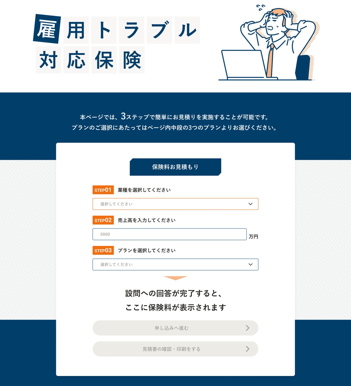 本商品で提供される補償は、従業員を雇用する企業が最低限備えるべき内容に限定しており、シンプルな商品設計とお手頃な保険料を実現しています。さらに、見積もりの請求から加入手続きの完了までオンラインで完結できるため、忙しい人事・労務担当者の方でも時間や場所を選ばずに検討・契約を進めることが可能です。
