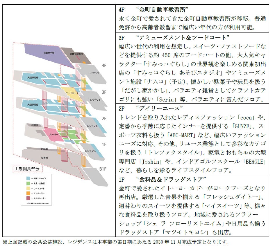 本計画は2段階の開業を想定しており、今回第I期として、「MARK IS 葛飾かなまち」「金町自動車教習所」「葛飾区東金町一丁目自転車駐車場」をオープンします。