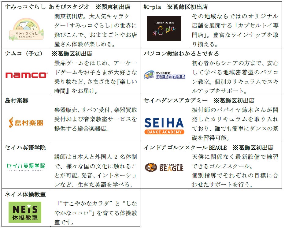関東初出店となる「すみっコぐらしあそびスタジオ」や「ナムコ」(予定)などのエンタメ店舗からインドアゴルフスクールの「BEAGLE」など、幅広い世代が遊んで学べる店舗が揃っています。