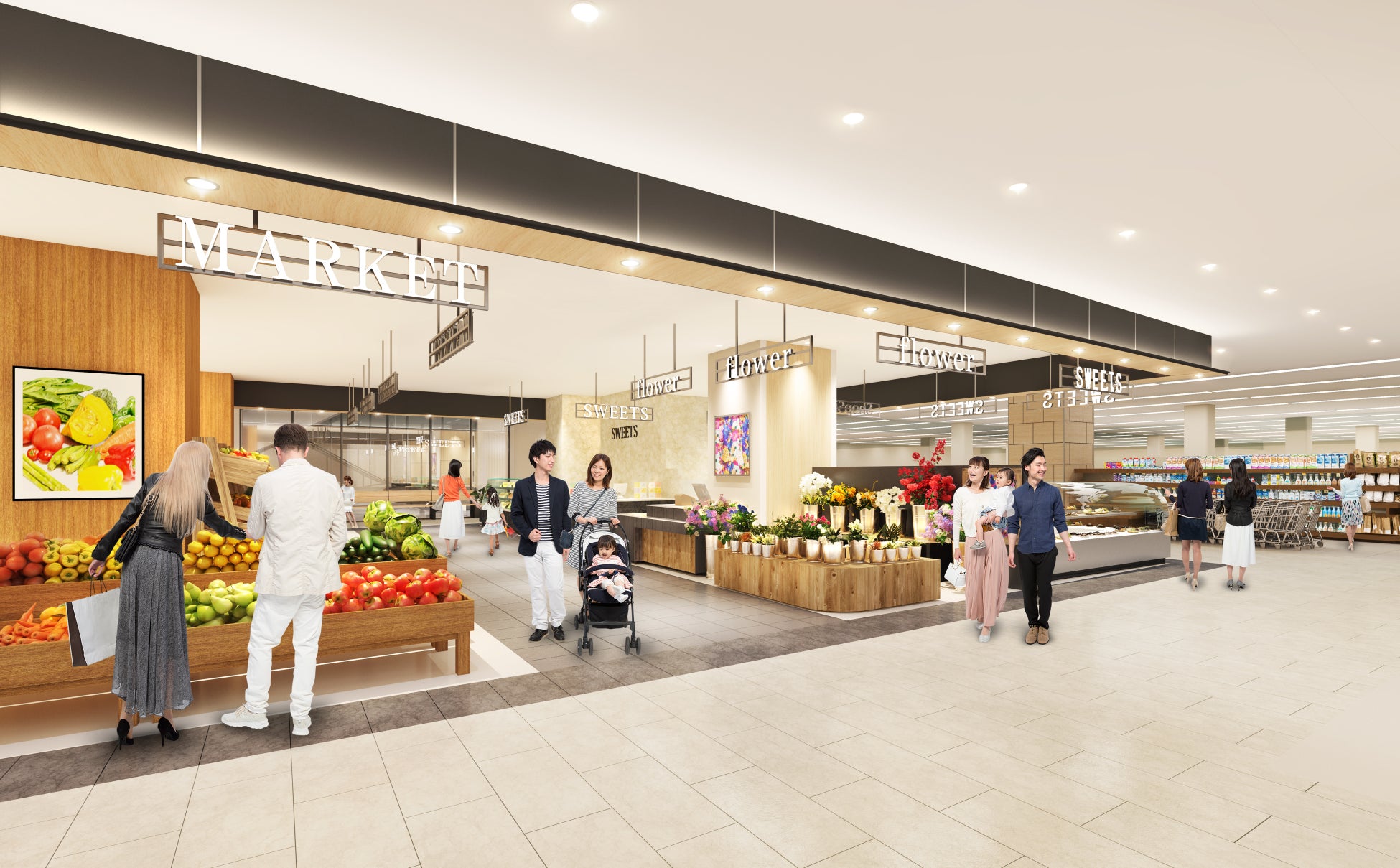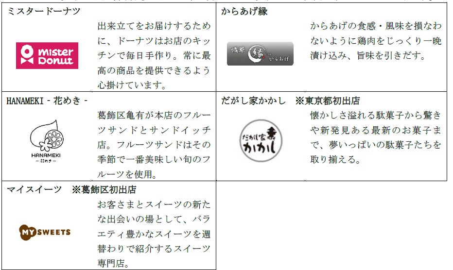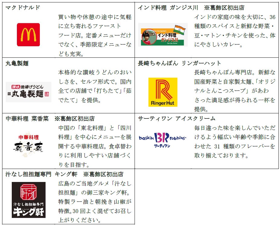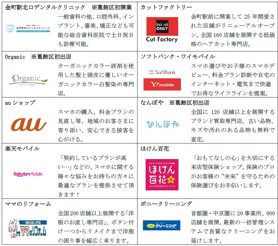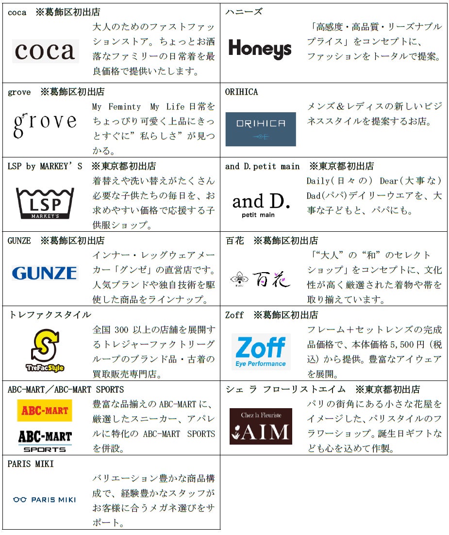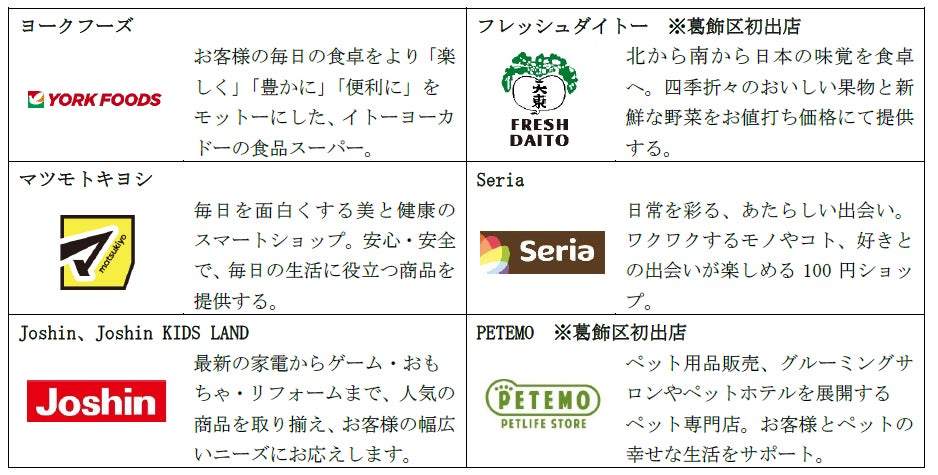 地域住民や金町駅利用者を中心とした幅広い世代のユーザーを対象に、アパレル・生活必需品や生鮮・スイーツ等のグルメ店舗など、バラエティ豊かな50店舗が出店。なかでも1973年の開店より49年間愛された「イトーヨーカドー金町店」については、「ヨークフーズ MARK IS 葛飾かなまち店」として生まれ変わり、今後も地域のお客様をお出迎えします。