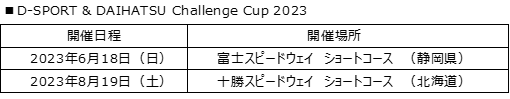 また、「D-SPORT & DAIHATSU Challenge Cup 2023」の開催スケジュールが下記の通り決定致しましたのでご連絡致します。各大会の募集告知は、改めてご案内致します。