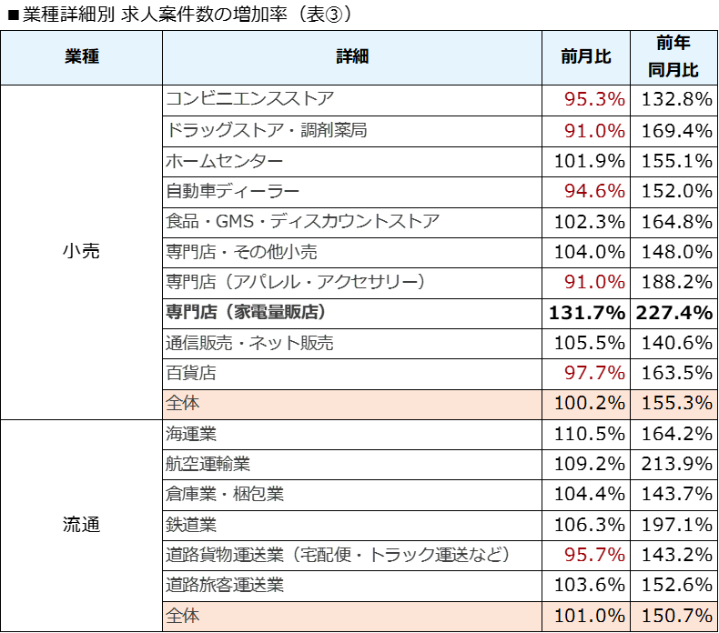 専門店(家電量販店)の求人案件数は2022年6月ごろから大きく伸びており、2022年11月は、前年同月比で227.4%になりました(図②、表③)。その背景には、大きく2つの要因が挙げられます。