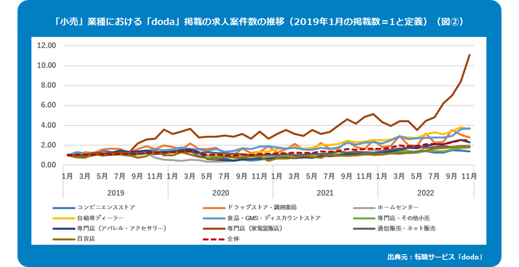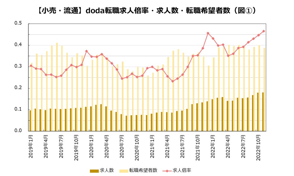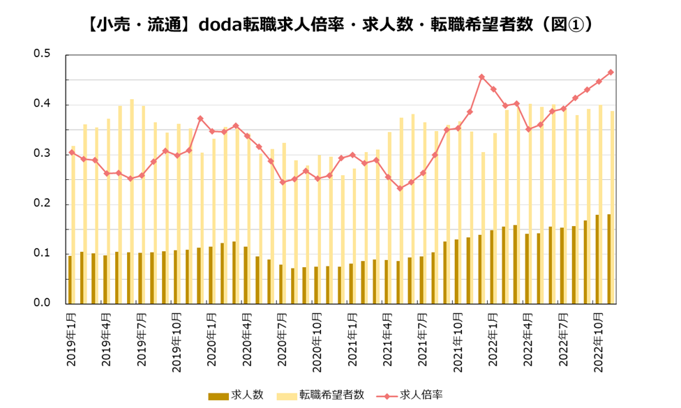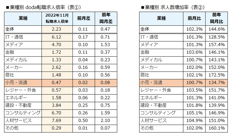 【小売・流通業界】doda転職求人倍率 2022年11月は0.47倍(前月差+0.02ポイント)