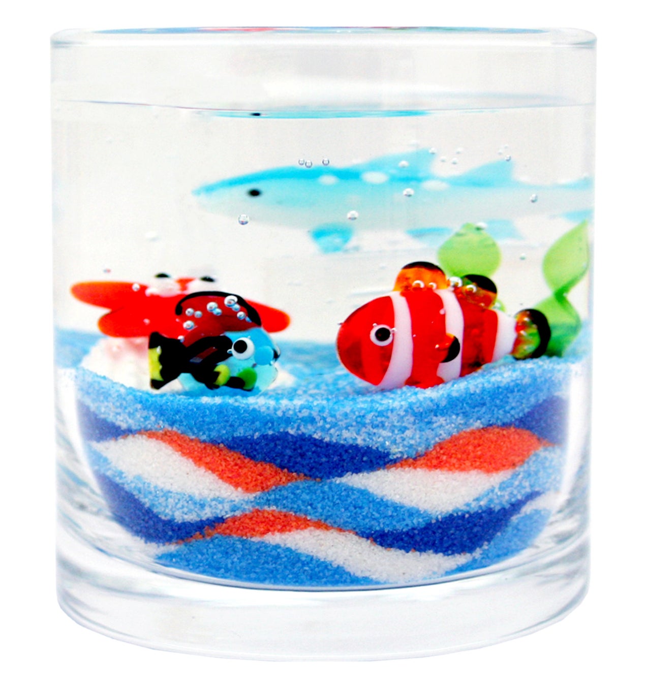 グラスの中に色鮮やかな砂を敷き詰めてガラス細工を配置すれば,世界に1つだけのキャンドルが完成!