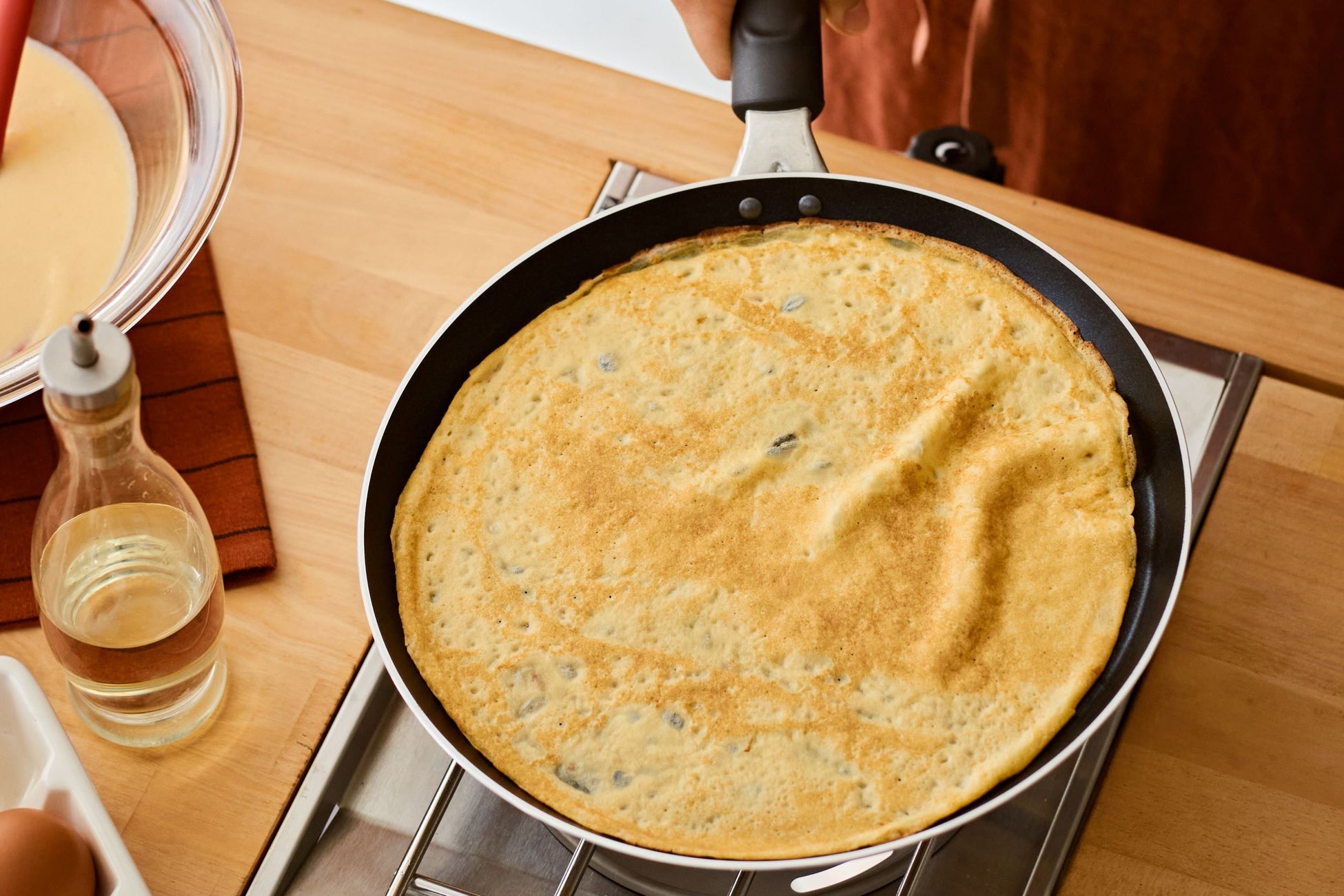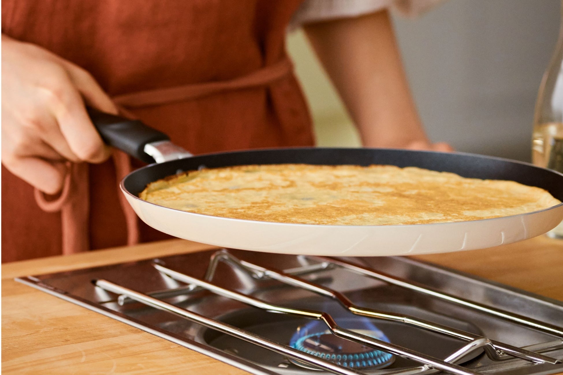 一般的なフライパンよりも軽く、浅い形状が特長。この軽さ、形状により、片手でもフライパンをパッと振れて、薄い生地も簡単に裏返すことができます。