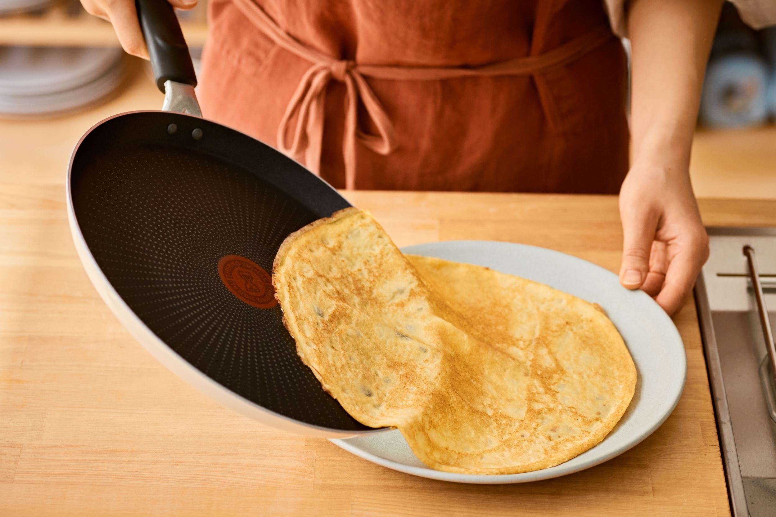 中面には、耐久性に優れたティファール独自のチタン・インテンス コーティングを施しています。そのため、使い始めのこびりつきにくさが長持ち。クレープやガレットのような薄い生地でも破れず、キレイに焼き上げます。