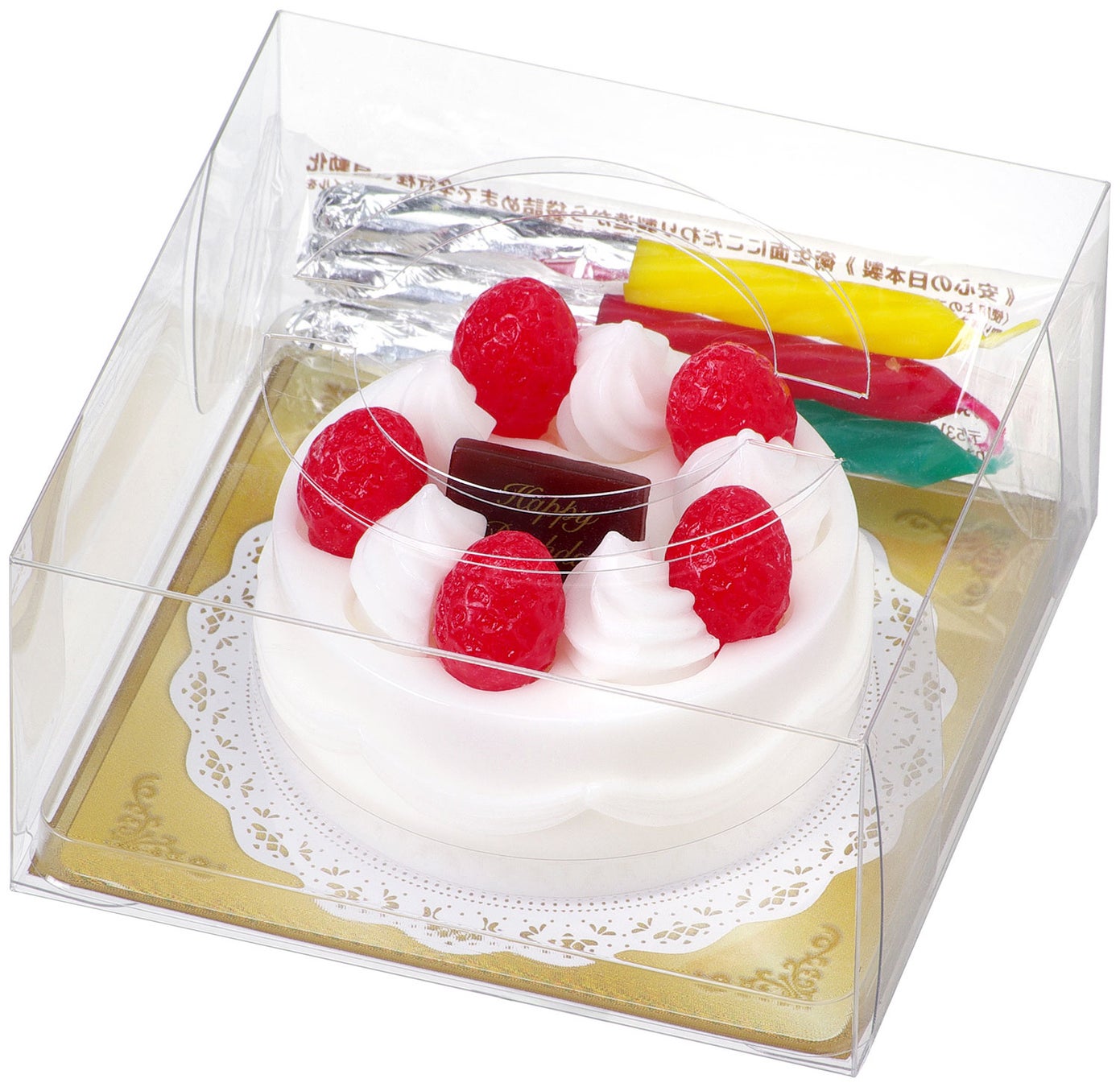 どこか懐かしさを感じる昭和レトロなレースの敷紙とゴールドのトレイ。これも昭和時代を彷彿させるオーソドックスなイチゴと生クリームのケーキをすべてロウでリアルに再現しました。バースデーキャンドルも3本ついてます。