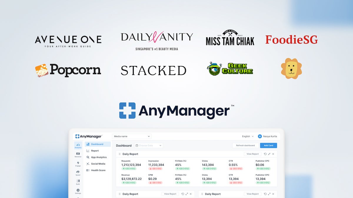AnyMind Group株式会社(読み:エニーマインドグループ、代表取締役CEO:十河 宏輔、以下「当社」) は、 Stacked Homes、Geek Culture、Popcorn.sg、Miss Tam Chiak、Daily Vanity、AVENUE ONE、Shicheng News、FoodieSGなど、シンガポールを拠点として、Webメディアを運営する複数のパブリッシャーと、広告収益化における独占パートナー契約を締結したことを発表いたします。今回の取り組みを通して、当社はAnyManagerを活用し、PMPや純広告の獲得及びメニュー設計なども含めた、多角的な支援を行ってまいります。